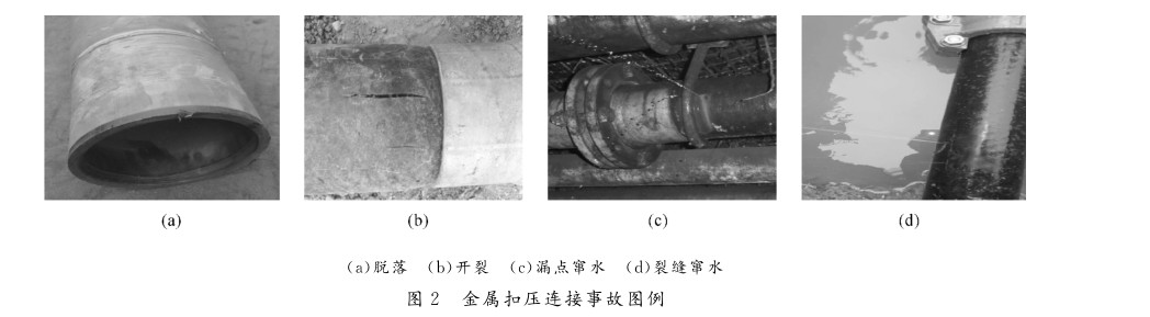 鋼絲網骨架聚乙烯復合管采用金屬扣壓連接可以滿足3.5MPa以內的連接技術要求。但這種連接在承壓能力較高時,長期穩定性較差,易發生管道系統金屬扣壓接頭脫落、竄水、竄氣等問題,見圖2。