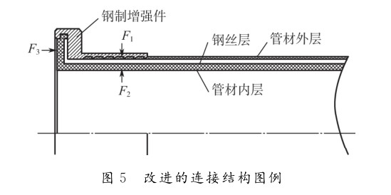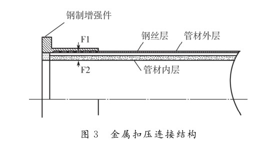 1.6MPa時,通常使用金屬扣壓連接。在常規的金屬扣壓連接中,復合管中鋼絲與鋼制增強件之間的連接,靠的是鋼制增強件與復合管材內壁之間夾持力F1及F2,如圖3所示。