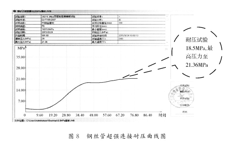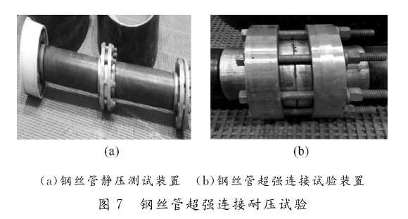 (2)根據對鋼絲管超強連接實驗結果表明,將鋼絲管連接端部的鋼絲固定,致使鋼絲管在承壓時不被抽動,有效地解決了鋼絲管材中鋼絲的連接的問題;經過耐壓試驗達到21.36MPa,表明鋼絲管這種超強連接技術是可行的;