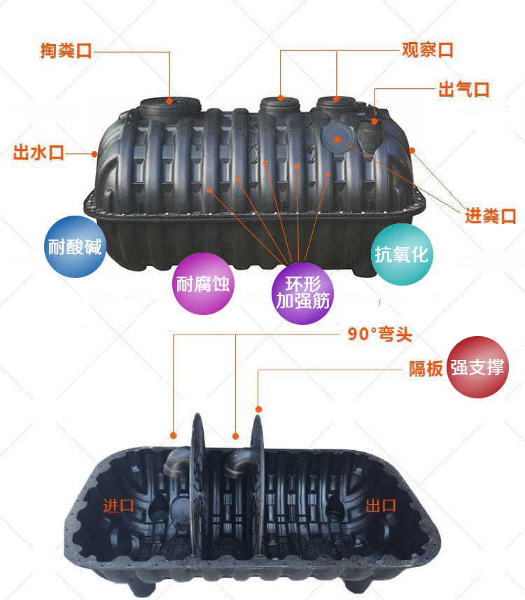 1.三格化糞池添加抗紫外線抗氧化的黑色母料,防止塑料化糞池久曬脆化,使化糞池壽命長。