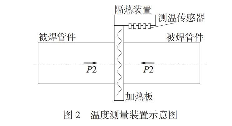 試驗所用焊接裝置采用自主設計的手動 PE管道熱熔焊接機,其試驗裝置如圖 1 所示,可實現焊接過程中加熱溫度、焊接位移、焊接壓力等參數信息的實時顯示。設備通過曲柄滑塊機構傳遞焊接過程所需壓力,壓力傳感器 1 安裝在夾持導向裝置上,監測焊接過程所施壓力;壓力傳感器 2 安裝在加熱板水平兩端,可對加熱壓力進行顯示;位移測量裝置與夾具連接,根據夾具移動量可獲取管道在對接時擠出的熔融層厚度;溫度測量裝置安裝在加熱板頂部,實時監測管道焊接區域的溫度。紅外探頭采用交錯式布置,點位分布如圖 2 所示,探頭沿軸向分別為距離加熱板端面 8.2,10.2,12.2,24.2,35.2 mm。