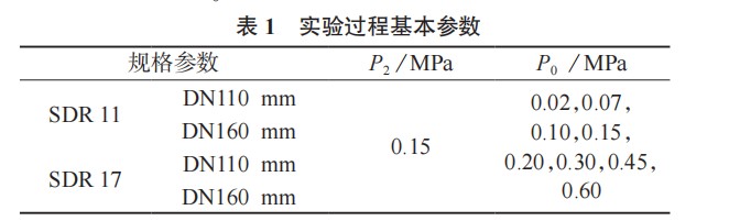 焊接試驗環境控制室內溫度為 27℃,空氣無流動,選取焊接工藝溫度為 215℃。根據 HG/T 4281–2011 塑料焊接工藝規程制備熱熔焊接接頭。接頭性能對溶膠壓力要求不高 [9–10],根據試驗所用手動式焊接裝置施壓機構的自鎖特點,施加一定溶膠壓力后,材料受熱熔化擠出,但夾具不因壓力的變化而移動,設備自行泄壓,可實現處理端面不平整目的,使熔化的塑料在微弱壓力下充分流動。因此試驗省去加熱階段人為泄壓一環,對各規格管道施加相同溶膠壓力,采用材料熔化泄壓的方式對管道進行加熱。再通過改變焊件對接時的焊接壓力,保證其余工藝參數不變的條件下進行試驗,利用位移測量裝置獲取管道在對接時擠出的熔融段長度,得出不同焊接壓力下,熔融層的擠出厚度值 ( 即焊接位移值 )。相關參數設置見表 1,表中溶膠壓力(P2)與焊接壓力(P0)均為焊件截面壓強。