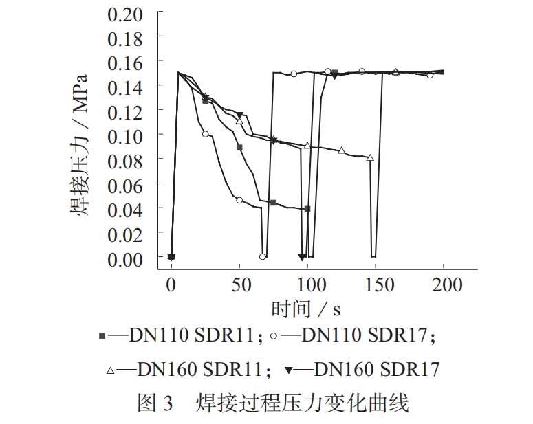 4 種規格管道按推薦壓力值 (0.15 MPa) 進行試驗,管道焊接端面壓力變化曲線如圖 3 所示。截取焊接過程前 200 s 數據示出。在加熱階段施加相同加熱壓力后,管道受熱熔化進行自主泄壓;隨加熱時間的增加,不同規格的管道在泄壓速率上呈現出了明顯的差異,表現為管徑越大,泄壓速率越高;加熱階段后期,4 種管道泄壓速率均出現放緩,形成相對平衡的態勢,表明此時熔融物的擠出量已逐漸趨于零,端面進行充分吸熱;加熱結束后,管道進入壓焊階段,并在焊接壓力作用下逐漸冷卻至室溫,焊縫以重結晶的方式結束整個焊接過程。