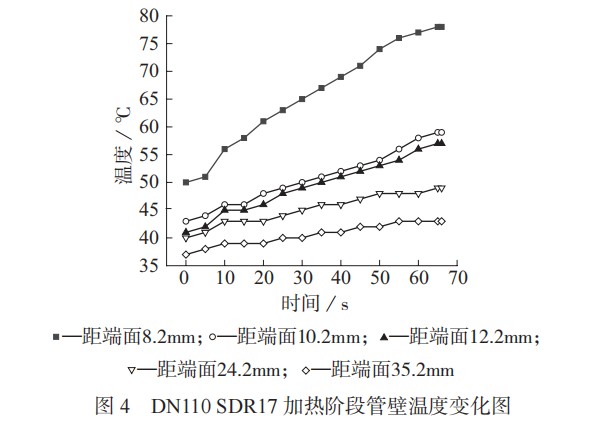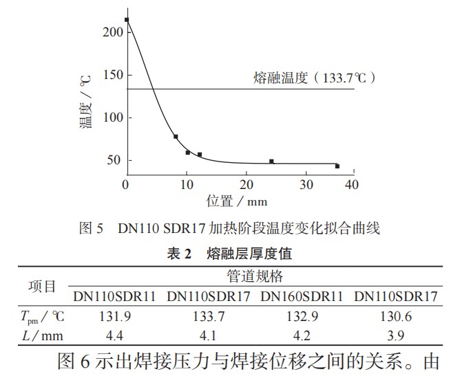 通過溫度測量裝置,測得加熱階段各場點的溫度實時變化過程。圖 4 為加熱階段管壁溫度變化圖。對加熱結束時的場點溫度進行數據擬合,結果如圖 5 所示,管道不同場點溫度在加熱階段呈現出近似線性增長的趨勢。研究過程中利用德國耐馳公司生產的 DSC200F3 型分析儀對試驗材料進行了差示掃描量熱 (DSC) 法試驗,獲取了材料確切的物理性能。測試條件為:樣品 (6.4±0.1) mg ;升溫速度10℃/min ;氮氣流量 50 mL/min ;加熱溫度 20~300℃。結合 4 種管材溫度場和 DSC 試驗結果,以熔融溫度 (Tpm) 為界限,得出熔融層厚度值 (L),見表 2。因管道屬性不同,各管道實際 L 也有所不同,進一步證明傳統工藝下的接頭焊接質量,受客觀因素影響較大,環境或者材料屬性的變化,可能導致管件 L 無法達到熱熔對接的要求。