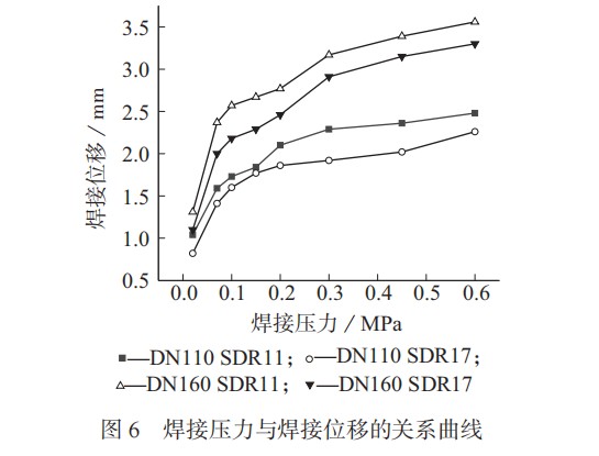 圖 6 可見,同種管道下的焊接位移隨焊接壓力的增大而增大,在增長速率上,PE 屬于線性非晶態共聚物,加熱后的管道存在 3 種不同聚集狀態,分別為玻璃態、橡膠態和熔融態 ,管材的彈性系數與抗形變能力隨溫度的降低而增大,因此焊接位移變化速率隨焊接壓力的增大而減小。
