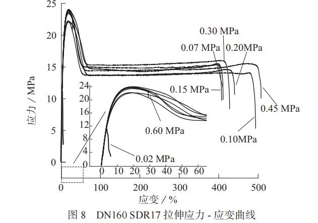 主要考察試樣拉伸強度、斷裂伸長率、斷口位置及斷裂方式,以此作為評價熱熔焊接試驗接頭性能的依據。以 DN160 SDR17 為例,不同焊接壓力下的拉伸應力 – 應變曲線見圖 8。通過 4 種規格管材在拉伸試驗結果對比分析,整體上可將各試樣拉伸應力 - 應變曲線分為 3 種形式,以下分別分析。