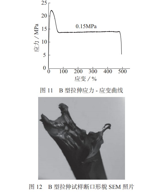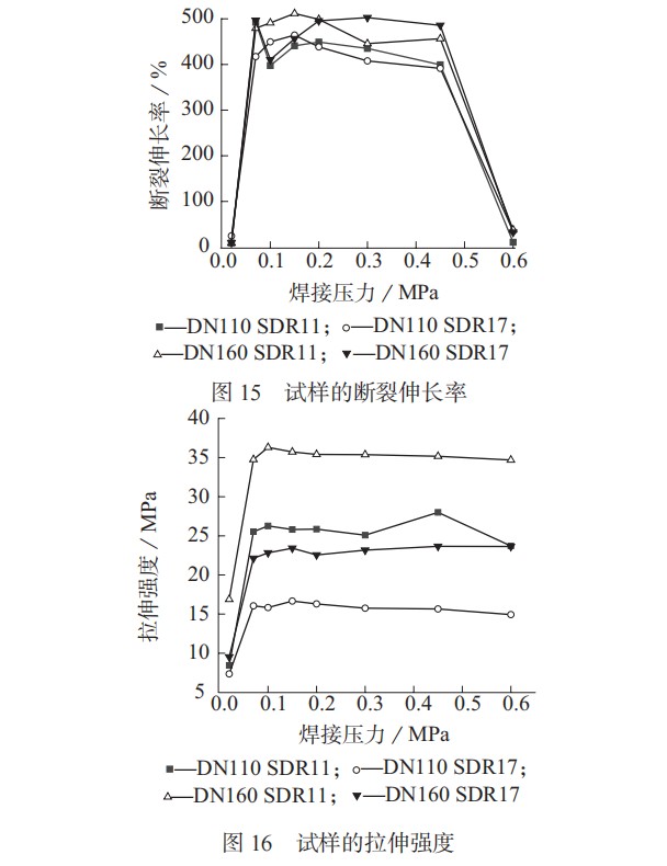 以圖 15、圖 16 示出。從圖中所示數據以及對試驗過程的觀察發現,焊接壓力在 0.07~0.45 MPa 內的試樣,其斷裂伸長率基本達到 400% 以上,斷裂形式為基材拉伸 – 基材斷裂,斷裂方式為韌性斷裂。