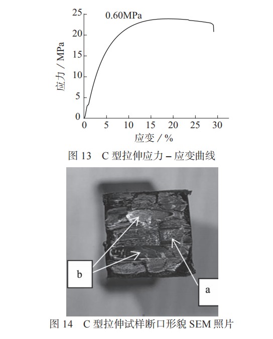 第三種 C 型拉伸應力 – 應變曲線如圖 13 所示。主要存在于焊接壓力過大的管道焊接接頭。管道在焊接壓力為 0.60 MPa 下的接頭試樣拉伸試驗結果。試樣斷口形貌的 SEM 照片如圖 14 所示。斷面宏觀上呈現大面積白色銀紋區域 ( 圖 14 中 a 區域 ),中部光滑區域 ( 圖 14 中 b 區域 ) 出現解理斷裂現象,此現象為典型的脆斷特征。在此工況下出現拉伸脆斷原因:過高的焊接壓力致使接頭處溶膠被大量擠出,剩余焊接面熔融物不足以滿足強度要求,加之管道熔融冷卻過程等同于對管材進行了退火處理,使熔融區內晶粒進行再結晶,提高管材結晶度,同時導致韌性下降,因此當拉伸應力到一定程度后,試樣在尚未表現出明顯形變的情況下,在焊縫處直接脆斷。