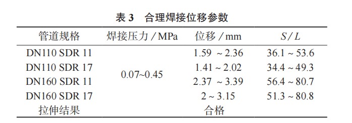根據 GB/T 19810–2005 評價標準做出結論,在0.07~0.45 MPa 焊接壓力區間內所制備的熱熔焊接頭,其性能可滿足標準要求。與焊接壓力相對應的焊接位移區間和 S/L 值區間由表 3 統計看出,通過控制位移參數,達到一定范圍內的 S/L 值可以得到合格的管道熱熔焊接頭。DN110 SDR 11 管道的合格 S/L 值區間為 36.1%~53.6%,DN110 SDR 17為 34.4%~49.3%,DN160 SDR 11 為 56.4%~80.7%,DN160 SDR 17 為 51.3%~80.8% 。