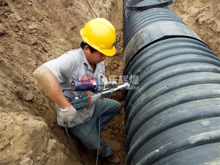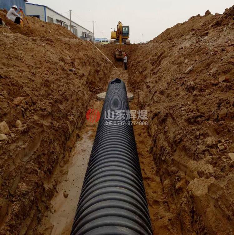 梁山龜山河工程主要用到的管材是山東輝煌生產的“煌達”牌鋼帶增強螺旋波紋管,山東輝煌“煌達”牌鋼帶增強螺旋波紋管是以高密度聚乙烯(HDPE)為基體,用表面涂塑粘接樹脂的鋼帶成型為波形作為主要支撐結構,并與聚乙烯材料纏繞復合成整體的螺旋波紋管。 鋼帶增強螺旋波紋管很好的結合了鋼、塑各自的優點,用連續鋼帶壓成近似“U” 形的鋼筋被纏繞在內外兩層熱熔接的聚乙烯間,把鋼材的高剛度、高強度和聚乙烯的柔韌、耐腐、耐磨等優良性結合起來,可使管材達到SN8、SN12.5、SN16 三個級別環剛度,解決了鋼材的耐腐蝕問題,突破了較大直徑全塑料埋地排水管環剛度一般只能達到SN8的限制